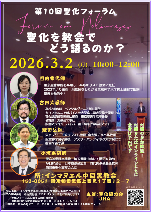 | 2026/3/18 聖化フォーラム限定配信のご案内 第10回聖化フォーラムは多くの方のご参加をいただき、活発な質疑応答もなされて大変有意義な時となりました。 そこで今回参加できなかった方々のために限定配信をいたします。 チラシのQRコード、または以下のリンクより「動画配信希望」にチェックを入れ、 視聴料として1000円を指定口座にお振込みください。 お申し込みいただいた方に動画のリンクをご案内します。 リンクはこちら 2026/2/16 2026年3月2日(月) 第10回聖化フォーラム開催のお知らせ ![]() 2025/9/11 関東聖化交友会 聖化大会 開催のお知らせ <こちら> 2025/5/21 関東聖化交友会 春の青年大会 プレイズ&トーク開催のお知らせ <こちら> 2025/2/22 第8回JHA聖化フォーラムのご案内 <こちら> 2024/9/9 第35回関東聖化大会 ご案内<こちら> 2024/5/21 聖化誌 70号・69号をアップいたしました<こちら> 2024/3/1 聖化フォーラム開催のお知らせ チラシのQRコード、もしくはこちらから 2023/11/17 ホームページ更新いたしました 秋の聖化大会のためにお祈りをありがとうございます。 無事に終了いたしました。 聖化の恵みをさらに求めていきたいと思います。 それぞれの聖会、セミナーは配信においてご覧になれます。 ぜひご覧ください。 ■ 関東聖化校友会 第38回 聖化大会 ■ 第83回ジョン・ウェスレーに学ぶ会(大阪) ■ 第36回 東海聖化大会 ■ 第28回 山形聖化交友会 聖化大会 ■ 第35回 聖化大会 仙台大会 ■ 第16回 岡山聖化大会 ■ 第23回 九州聖化大会 2023/2/15 ホームページ更新いたしました ■ 第38回 聖化大会 開催のお知らせ こちら 2023/2/15 ホームページ更新いたしました ■ 2023年3月開催「聖化フォーラム」お申し込み受付中 ■ 各地の聖化大会アーカイブ動画公開しました ・関東聖化大会 ・東海聖化大会 ・九州聖化大会 ・第80回JWに学ぶ会