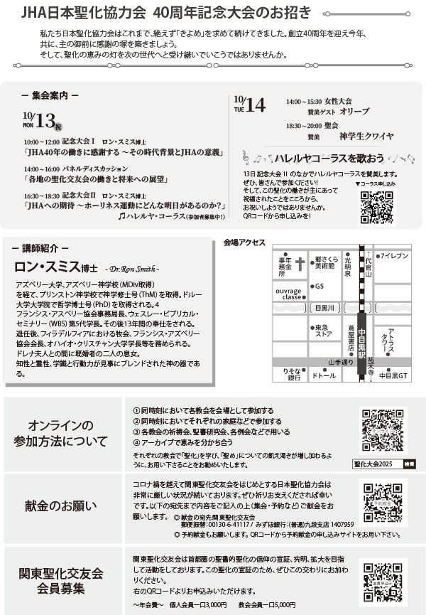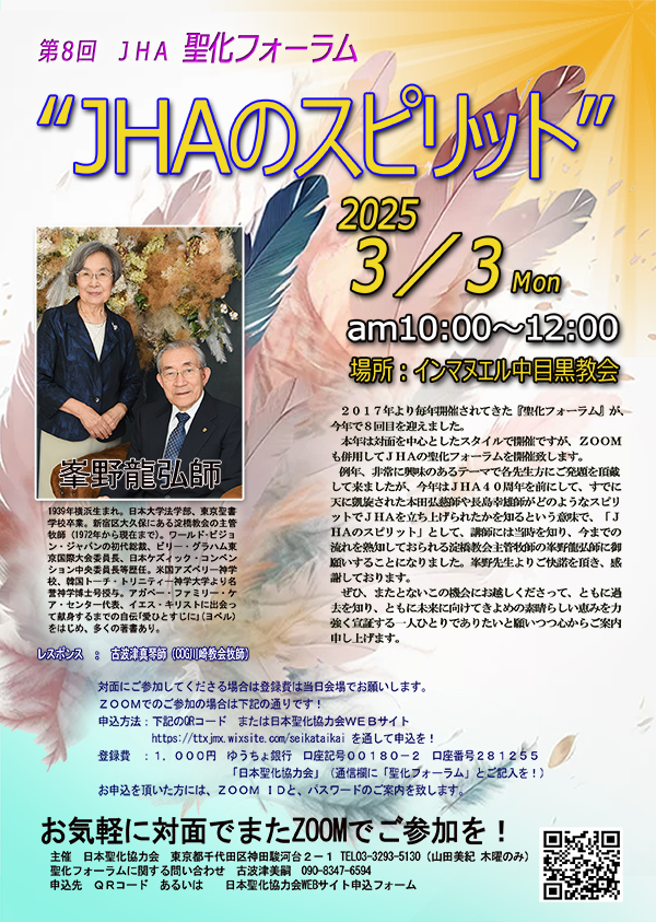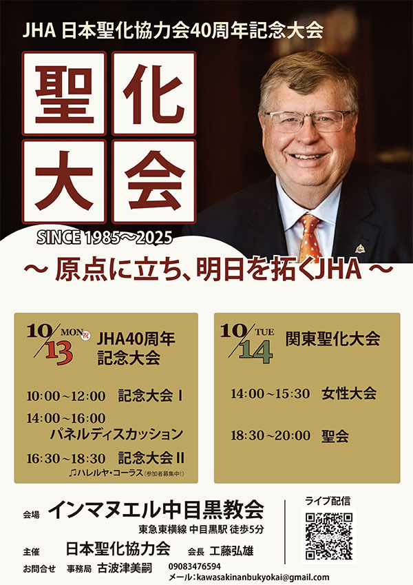 2025/9/11 関東聖化交友会 聖化大会 開催のお知らせ <こちら>![]() ![]() 2025/5/21 関東聖化交友会 春の青年大会 プレイズ&トーク開催のお知らせ <こちら> ![]() 2025/2/22 第8回JHA聖化フォーラムのご案内 <こちら> ![]() 2024/9/9 第35回関東聖化大会 ご案内<こちら> 2024/5/21 聖化誌 70号・69号をアップいたしました<こちら> 2024/3/1 聖化フォーラム開催のお知らせ 秋の聖化大会のためにお祈りをありがとうございます。 無事に終了いたしました。 聖化の恵みをさらに求めていきたいと思います。 それぞれの聖会、セミナーは配信においてご覧になれます。 ぜひご覧ください。 ■ 関東聖化校友会 第38回 聖化大会 ■ 第83回ジョン・ウェスレーに学ぶ会(大阪) ■ 第36回 東海聖化大会 ■ 第28回 山形聖化交友会 聖化大会 ■ 第35回 聖化大会 仙台大会 ■ 第16回 岡山聖化大会 ■ 第23回 九州聖化大会 2023/2/15 ホームページ更新いたしました ■ 第38回 聖化大会 開催のお知らせ こちら 2023/2/15 ホームページ更新いたしました ■ 2023年3月開催「聖化フォーラム」お申し込み受付中 ■ 各地の聖化大会アーカイブ動画公開しました ・関東聖化大会 ・東海聖化大会 ・九州聖化大会 ・第80回JWに学ぶ会